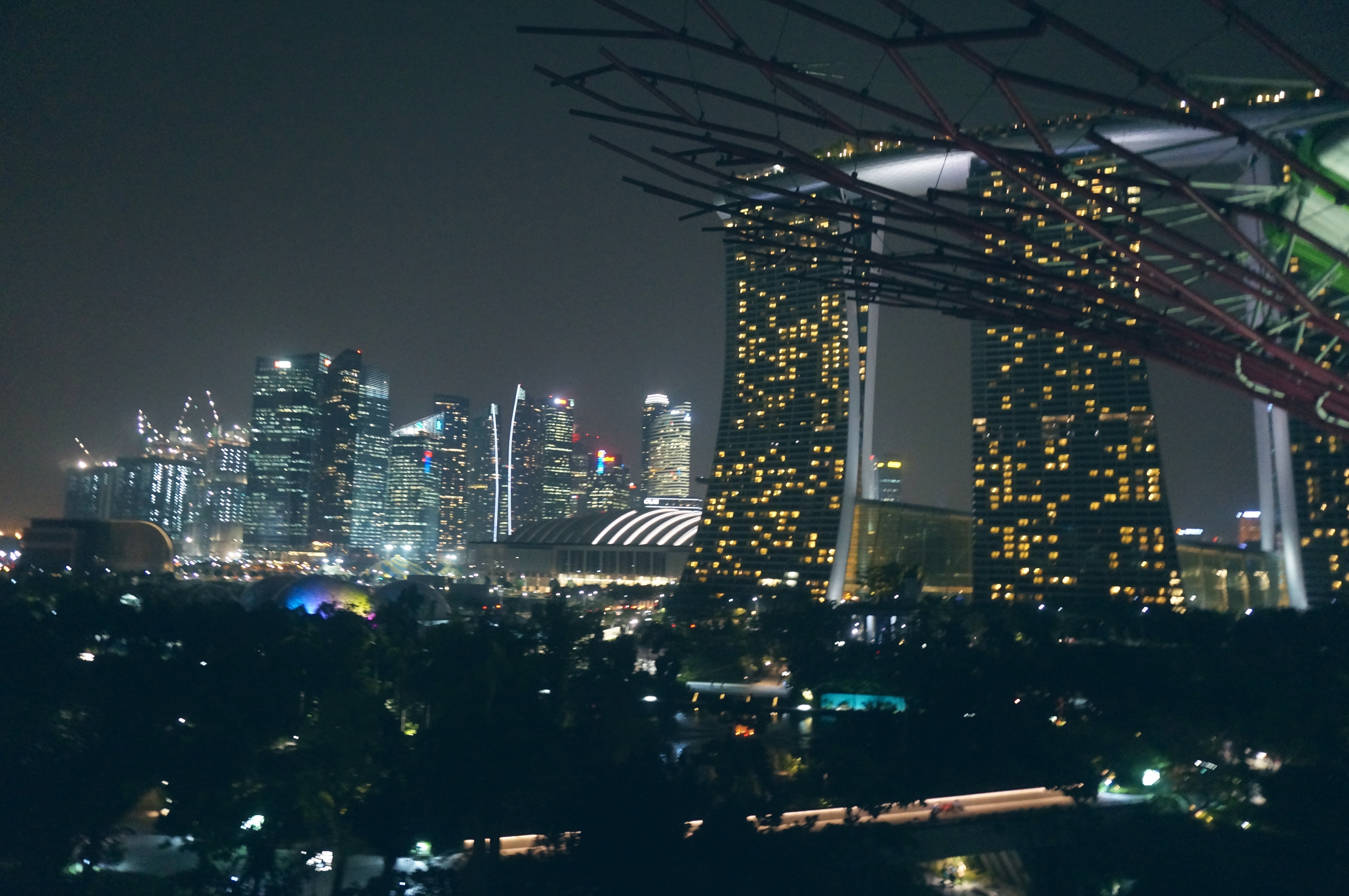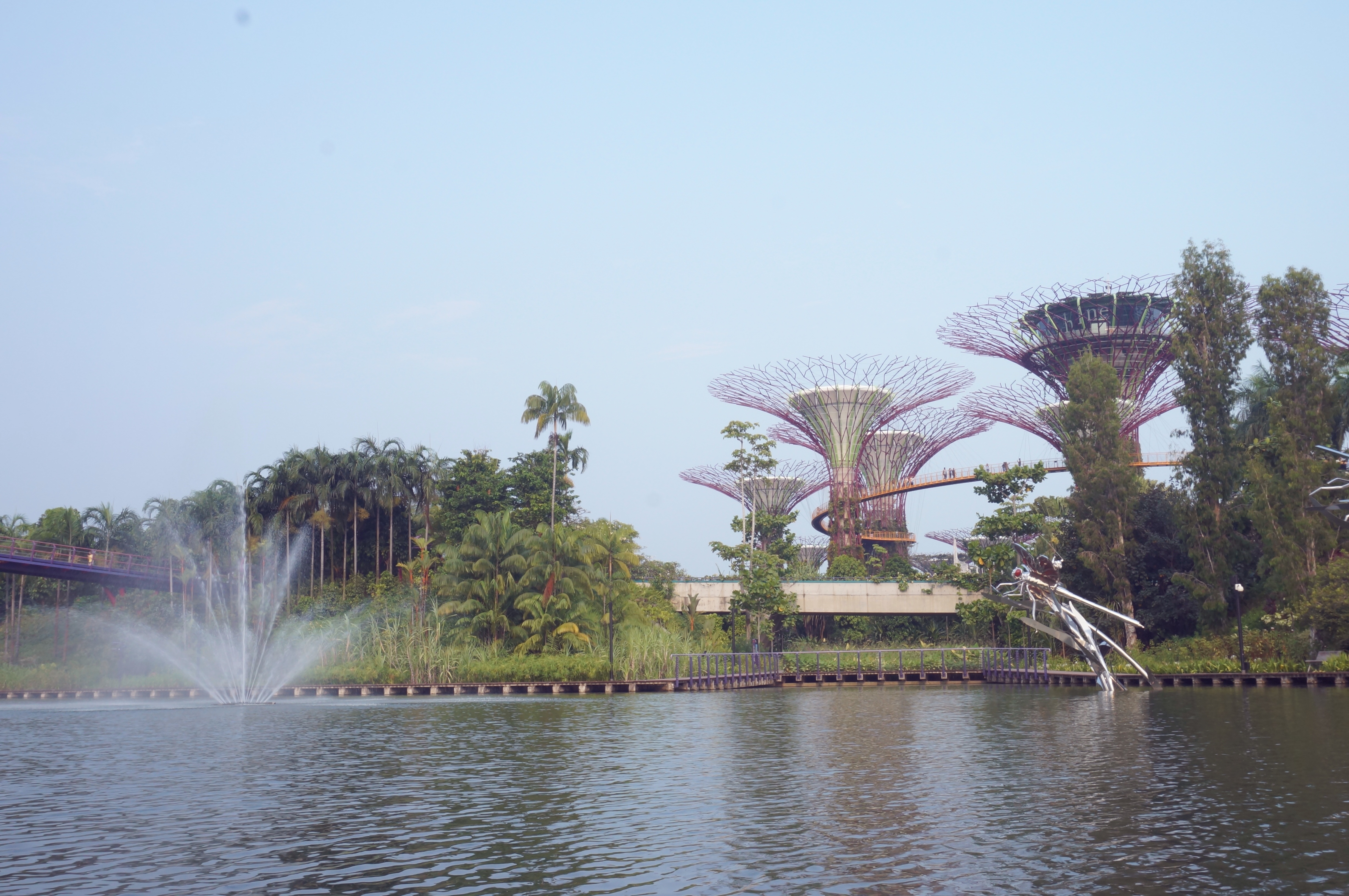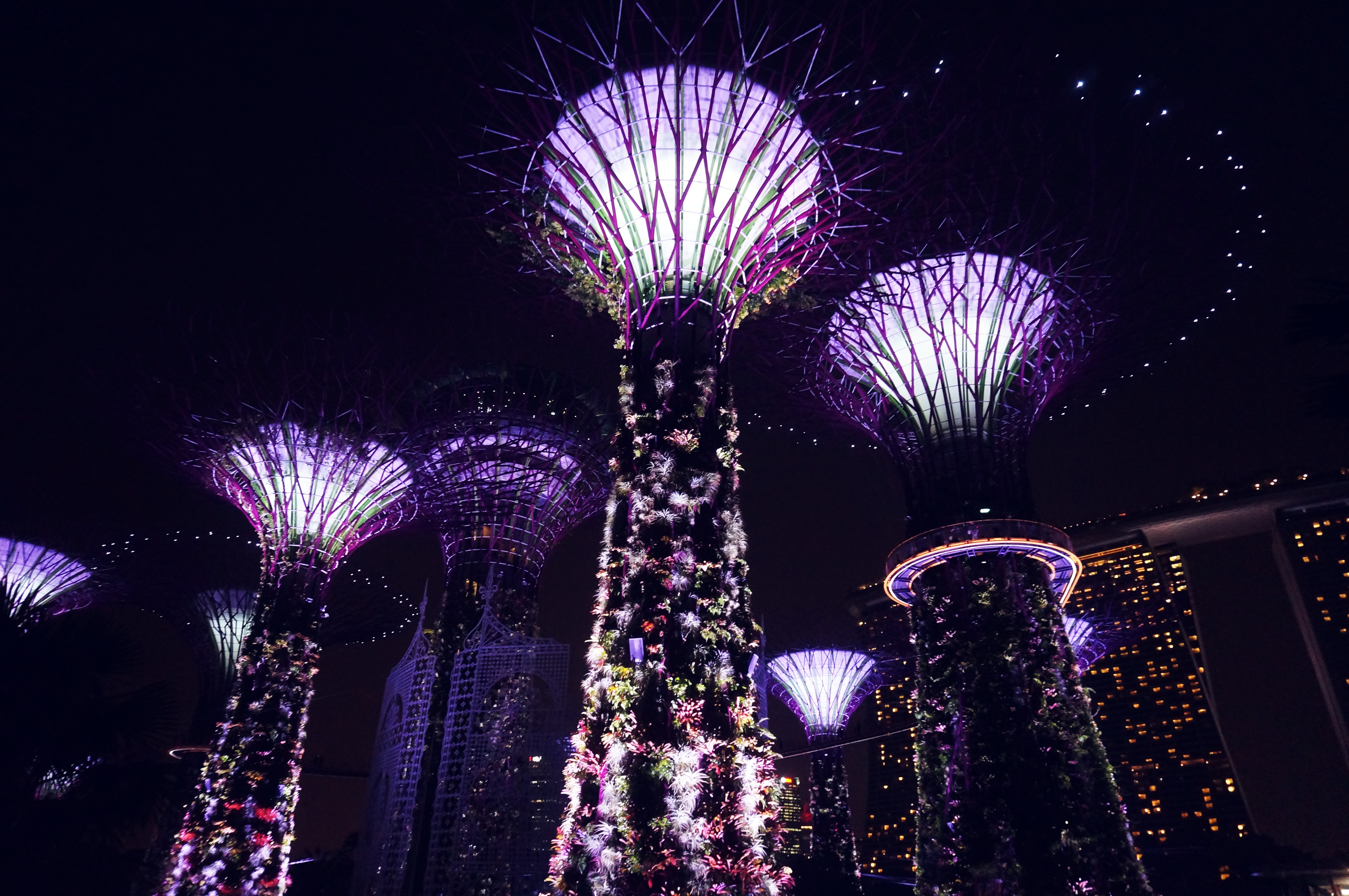 Khi con mắt đã no say trước vẻ đẹp nơi đây, cũng là lúc đôi chân lên tiếng đòi nghỉ. Chúng tôi tìm một góc khuất tại phía nam khu vườn Bay South, ngắm những siêu cây (Super trees Grove) có khả năng phát sáng với chiều cao tới 25-30m được ôm ấp bởi vô số các loài dương sỉ và các loài phong lan. Buổi tối, hàng trăm ánh đèn trên những siêu cây này đua nhau khoe những bộ cánh rực rỡ sắc màu. Chúng tôi hoà cùng dòng người đứng dưới những siêu cây ngước mắt lên ngắm những ánh đèn như các vì sao đổi sắc theo tiếng nhạc du dương. Lúc nhanh lúc chậm, những vì tinh tú nhân tạo ấy như đang cùng nhau nhảy múa theo điệu nhạc trong một dạ tiệc hóa trang. Ánh đèn từ những ngôi nhà trọc trời của thành phố toả sáng như tỉ thí với sắc màu trong khu vườn. Tôi thấy trái tim mình xao xuyến kỳ lạ. Xúc động không nói nên lời, tôi chỉ ước gì giây phút ấy không bao giờ ngừng. Khi tiếng nhạc kết thúc, tôi cùng đoàn người đi đi bộ trên cây cầu Skywalk bao quanh khu vườn cao 22m so với mặt đất. Từ đây thu vào tầm mắt cả thành phố huyền ảo lung linh trong ngàn vạn ánh đèn….