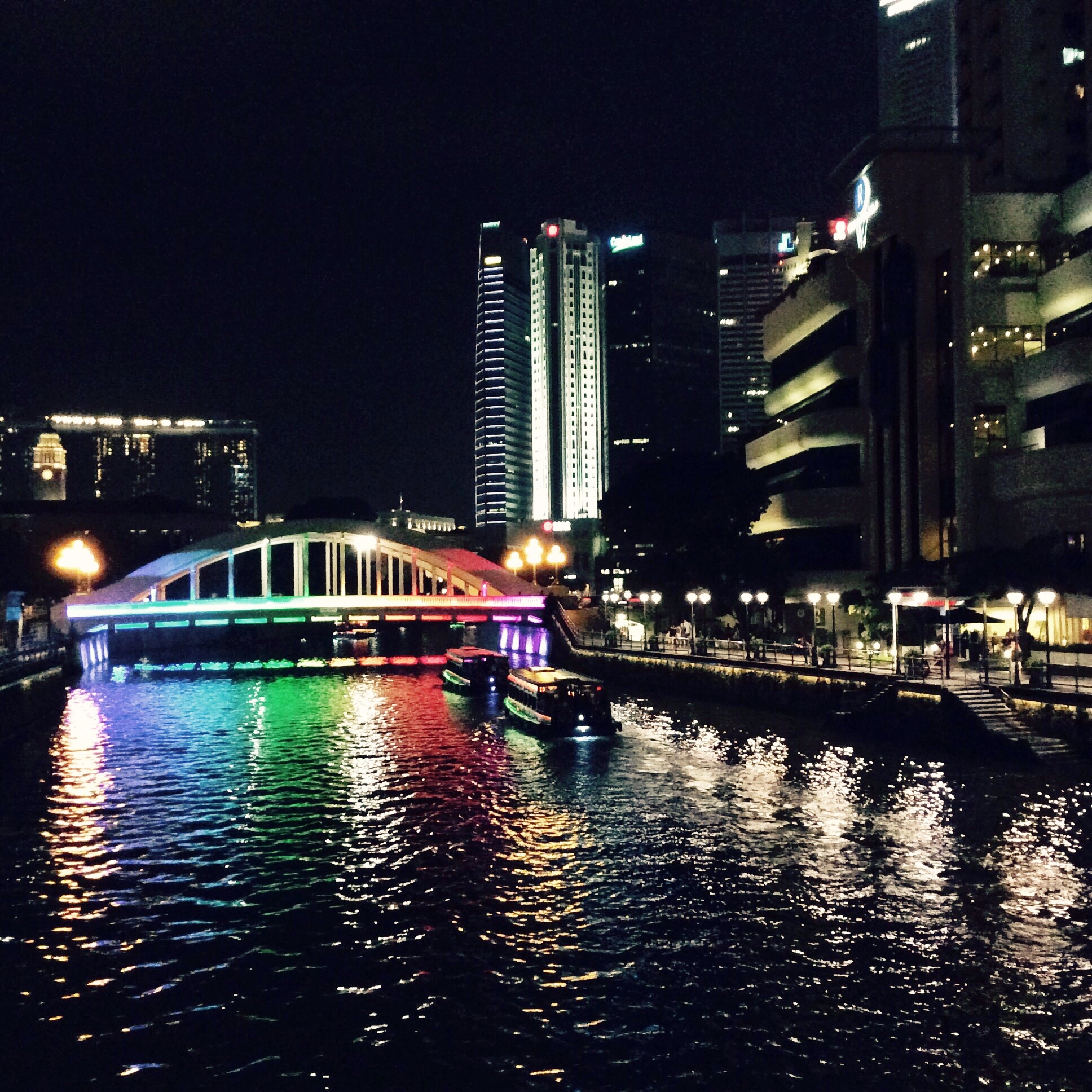 Tôi hỏi cô bạn đồng hành mà mắt không ngừng ngắm những con tàu đang nhẹ nhàng xẻ đôi dòng nước trên lòng sông Singapore. Con tàu di chuyển chậm rãi, như để đảm bảo rằng những vị khách đang ngồi trên nó có thể thư thái ngắm nghía cảnh đẹp đầy màu sắc 2 bên bờ sông, lại vừa có thể hít thở bầu không khí trong trẻo sau cơn mưa. Cơn mưa cuối ngày như một thứ gia vị tô điểm thêm cho vẻ thi vị, kiêu kỳ của thành phố Singapore. Cả thành phố tươi mát lấp lánh ánh đèn ôm trọn dòng sông xanh. Hai tay đặt trên thành cầu, tôi phóng tầm mắt ra xa ngắm những toà nhà cao tầng đầy sắc màu in bóng dưới dòng sông. Những tòa nhà cao tầng như những ngọn núi sừng sững đâm toạc lòng đất, đua nhau vươn lên với trời đêm. Dòng sông hiện lên như con suối nhỏ lọt thỏm, lững lờ uốn quanh chân núi. Đứng trước cảnh đẹp thơ mộng ấy, tôi không sao giấu nổi niềm hân hoan. Như cũng bị hớp hồn bởi khung cảnh lãng mạn đó, mãi một lúc tôi mới nghe thấy tiếng thầm thì của cô bạn đồng hành. Giong cô run run, phấn khởi, hòa tan với tiếng gió :