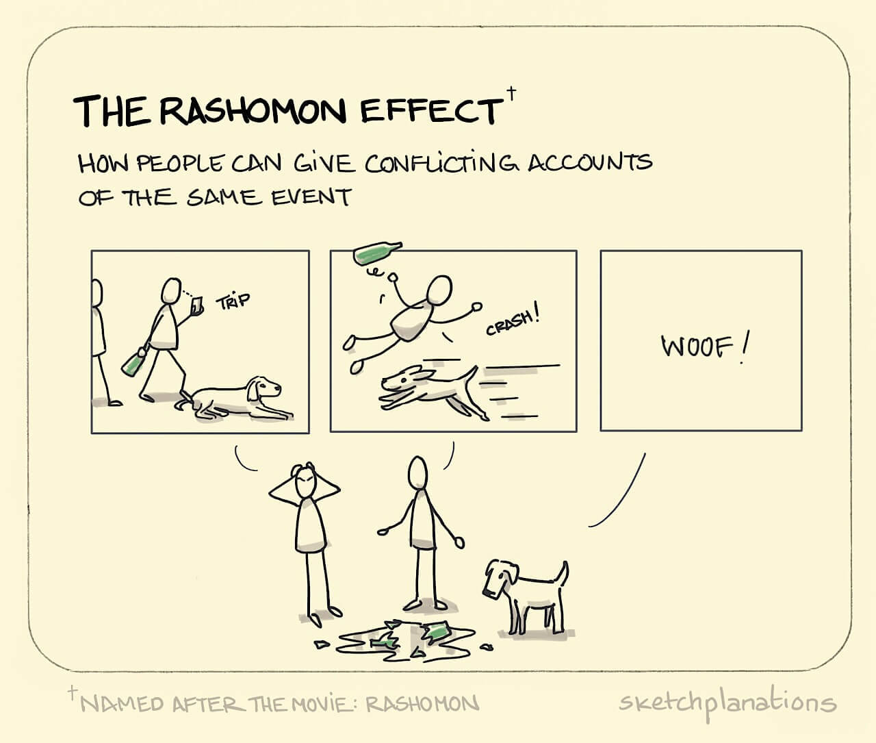 Tóm lại, “Hiệu ứng Rashomon” xảy ra khi mà các cá nhân liên quan đến một sự việc nào đó khi được yêu cầu thuật lại mọi chuyện lại kể một cách khác nhau hoặc đầy mâu thuẫn.